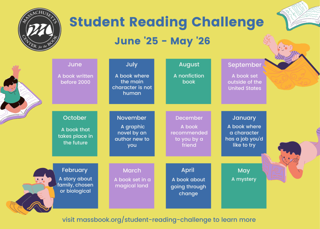 Join the 2025-2026 Student Reading Challenge for students of all ages! It’s a unique challenge brought to you by the Massachusetts Center for the Book with a new theme for each month. Pick up a passport at the main library or the Farms branch. To participate, all you have to do each month is read a book on the theme and stop by the Children’s Room, Reference Desk, or Farms branch to get a sticker on your passport. Fill out a form to be entered into a drawing for prizes run by the Mass Center of the Book. Students under the age of 13 will need a parent/guardian to fill out the form. Partnership with Mass Center for the Book.